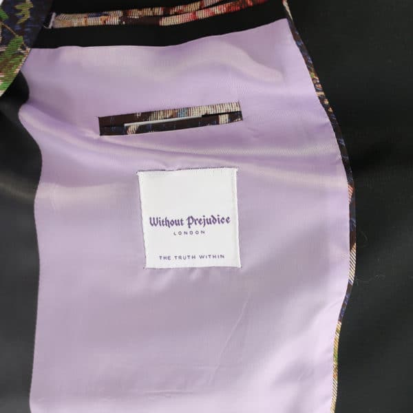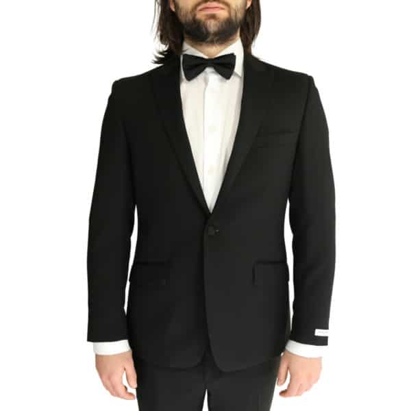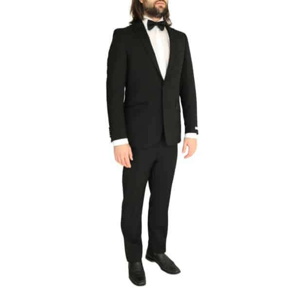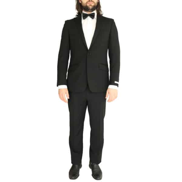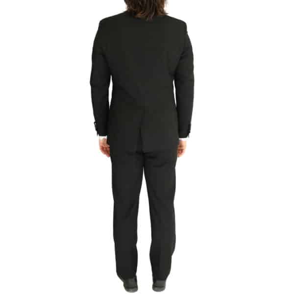 This black dress suit by Without Prejudice is tailored in super flex fabric with a solid weave. Blended with a generous amount of virgin wool. Also featuring peak lapels and satin lapels.