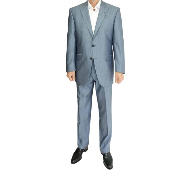 This slim fit wool & silk Without Prejudice suit features peak lapels, side vents, flat front trousers and working cuffs. A lightweight suit for spring/summer events.