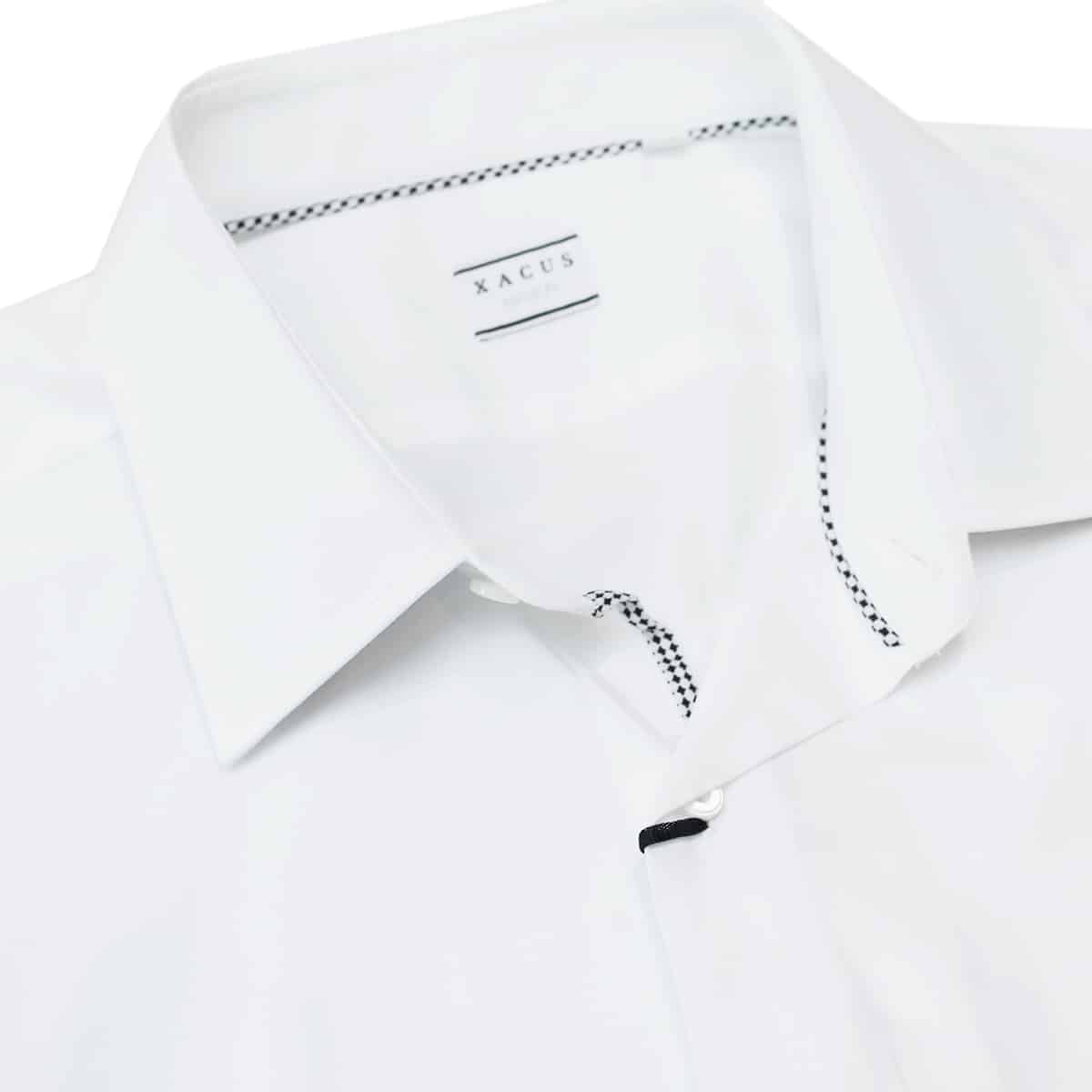 This white shirt from Xacus is made from a crisp and comfortable stretch cotton fabric. Cut to Xacus’s ‘tailor fit’ – a modern slim fit that looks and feels great. The shirt features a medium spread collar, mother of pearl buttons, as well as a diamond knit trim that can be seen on the cuffs when worn. Comes with collar stays to ensure that the collars stay in shape.
